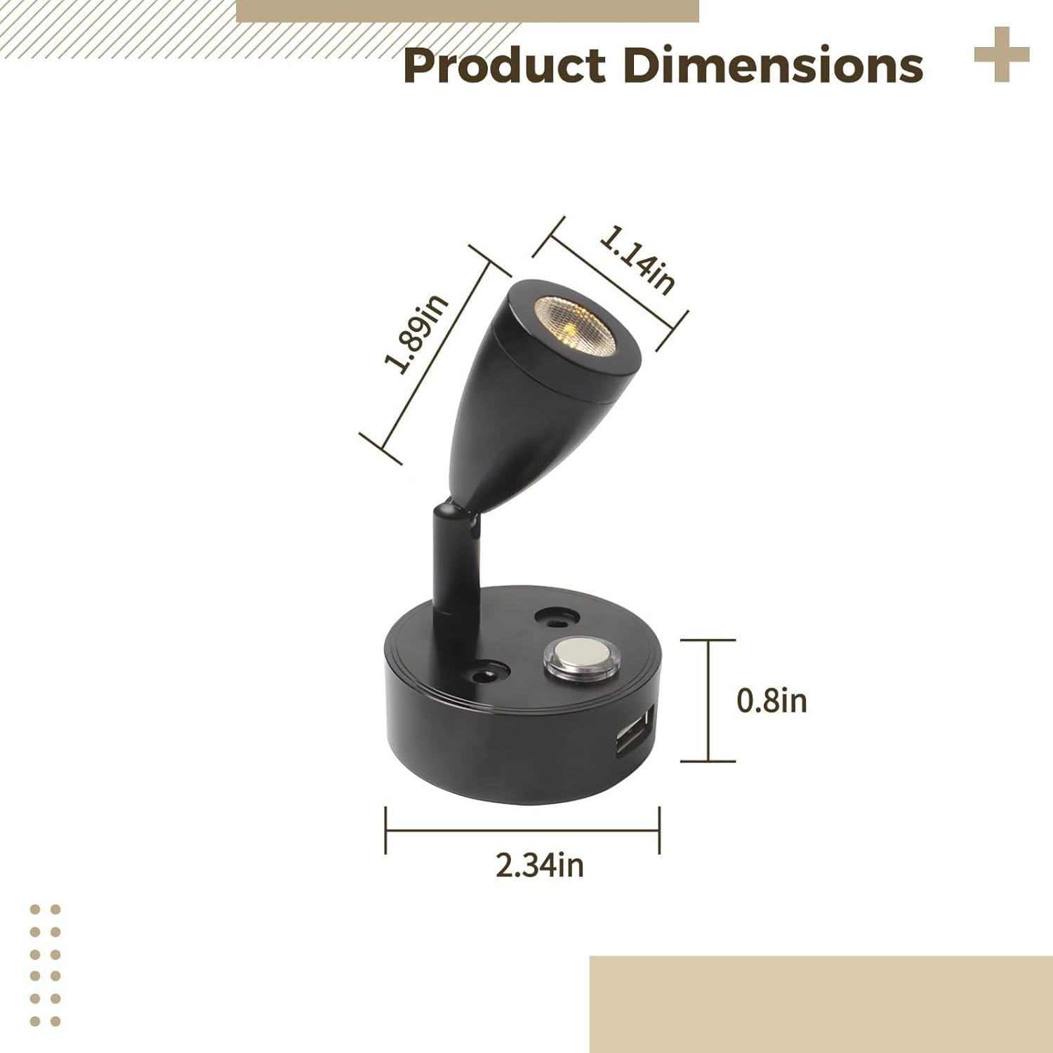 Color:black Material:metal Packing Size: 4.13 in x 3.74 in x 2.95 in Package Includes:2 x RV reading light, 2 x set of accessories, 2 x user manual Note: - Please refer to the measurement. Tiny measuring error is allowable in normal range. - There might be a little color difference due to the monitor, camera or other factors, please refer to the physical item.