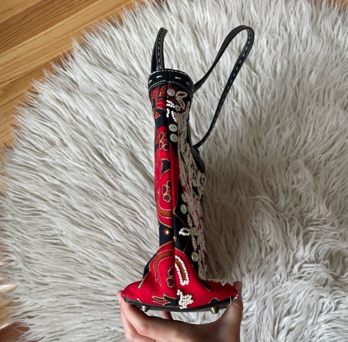 Add a touch of elegance to your outfit with this beautiful Isabella Fiore shoulder bag. The bag features a stunning paisley pattern on a red & black cloth exterior, with brass hardware accents. The bag has a black leather trim and features beaded accents that add a touch of glamour to the overall design.