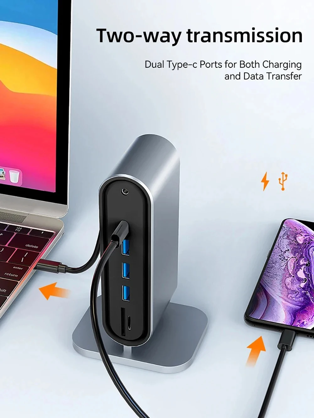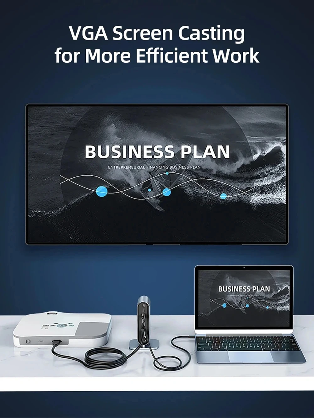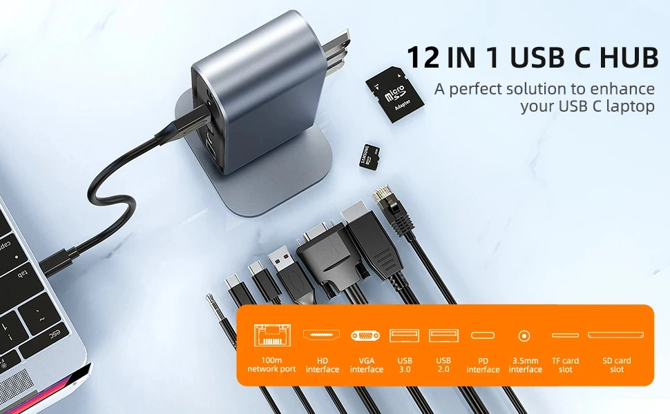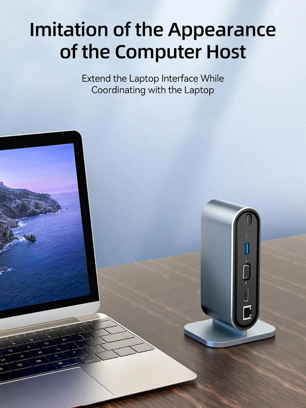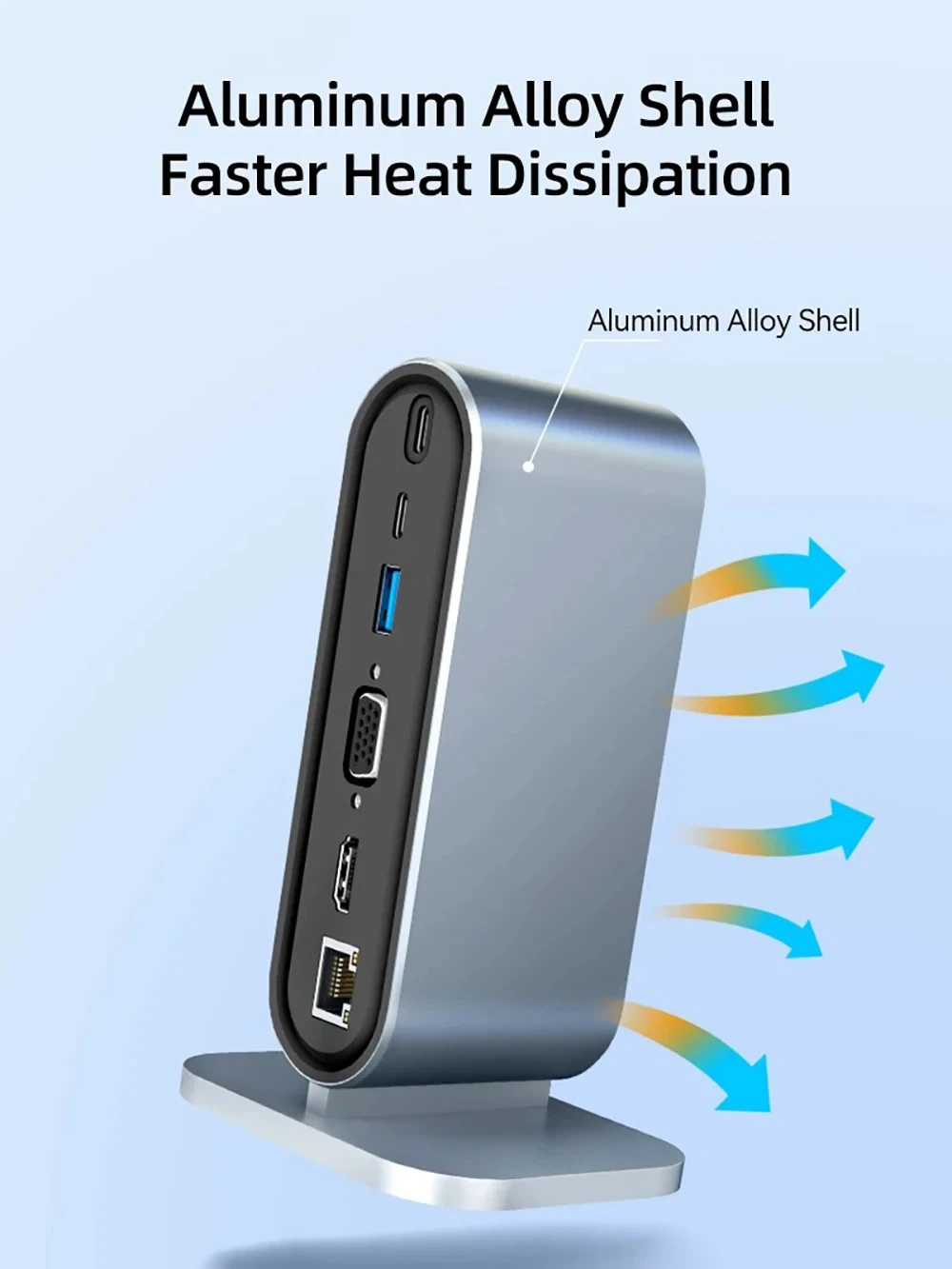 Extending your laptop with multi-ports,with 4xUSB 3.0 ports, 1x PD 100W, 4K interface ,1 Rj45 100Mbps, 1 VGA TF card reader slots, 3.5mm, ,Type C fast charging and for superior data transfer.